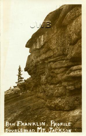 A fascinating gentleman named Jim Moore has a passion for rock formations with human-like appearances (similar to the Old Man of the Mountains). He recently “stumbled upon” my blog, and sent me a scan of an old postcard showing a Ben Franklin profile that exists, or used to exist at Doublehead Mountain, in Jackson, New Hampshire.