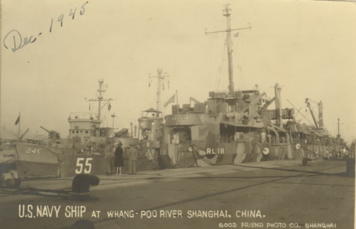 My father’s navy discharge papers and a postcard he saved provided additional insight. The mine sweeper he served on was the USS YMS 245 (see photograph above, the smaller boat with the number 245 on the bow, and FYI just to the right of the minesweeper is the larger landing craft repair ship, ARL18-Pandemus) . Apparently the YMS class of mine sweepers were wood-hulled, and all of them pretty much looked alike except some had two stacks, rather than one.