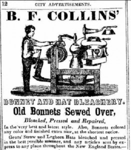 Advertisement from 1852 Manchester (NH) City Director for a bonnet and hat bleachery service (i.e. B.F. Collins’).