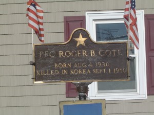 The sign reads: “PFC ROGER B. COTE. Born August 4, 1930. Killed in Korea Sept 1, 1950.” I have been honored to be able to speak with members of Roger’s family who still live in the Manchester area, who gave me additional insight into Roger’s life and death. I would like to especially thank Roger’s sister Rita (Cote) Brunelle who provided me with his photograph, and his brother Arnold and cousin Raymond Cote for sharing remembrances.