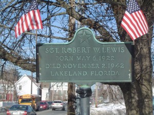 Another Military Square was added following World War 2, the ordinance passed on 16 December 1947 and signed by Mayor Joseph T. Benoit as follows: “That the square located where Massabesic Street, Hayward Street, Candia Road, and Mammoth Road intersects, be official designated … as Robert W. Lewis Square.” The plaque reads: “SGT. ROBERT W. LEWIS. Born May 6, 1922. Died November 2, 1942. Lakeland, Florida. “