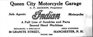1915 Advertisement in the Manchester (NH) City Directory of Queen City Motorcycle Garage located at 50 Granite Street. They sold Indian motorcycles, a competitor to the Harley Davidson brand.