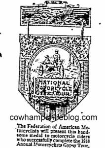 The May 25, 1918 edition of the Wyoming State Tribune (Cheyenne, WY), page 125 called the event the National Gypsy Tour and predicted 30,000 riders for that year [about 26,000 actually participated). They announced that The Federation of American Motorcycles would award a “handsome bronze medal” to each rider completing the tour. They went on to state that the average length of the tours in 1917 was 150 miles, or about 75 miles riding per day. The event was open to all riders, whether they were members of the FAM or not. The Saginaw News of 15 June 1918 stressed that with the war effort, and railroad and other transportation companies burdened, that the Gypsy Tour “offers a splendid opportunity for riders to take a patriotic vacation.”