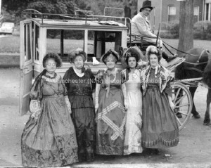 Group Portrait Centennial Parade of 1936; Mrs. Albina How –; Mrs. Jennie Currier, Mrs. Mary Mullen; Mrs. Blanch Label and Mrs. Doris Mibran (the carriage driver is not identified). Zerwick Photographer. Manchester Historic Association Collection. Used with permission.