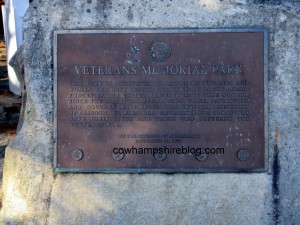 Merrimack New Hampshire’s plaque dedicating Veteran’s Memorial Park on Camp Sargent Road. Photograph copyright Janice Brown, taken November 2015