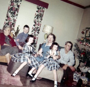 Kathleen and Janice Webster in their “best” dresses decorating the tree. Probably taken by their loving mom, Christmas 1959.