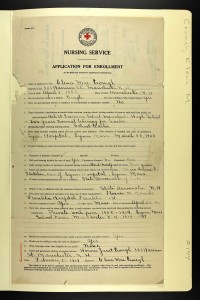 Elena Crough’s application to join the American Red Cross in 1917. Prior experience includes: private work from 1908-1914; school nurse Manchester NH 1914-1917.