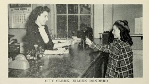 Mayor Mary C. Dondero swearing in her daughter, Eileen as City Clerk in 1946 from a local newspaper.