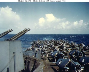 [Photo taken 3 days prior to Ensign Paul Boire’s death]. Scene on the flight deck [of the USS Essex (CV-9), looking aft from the carrier’s island during her shakedown cruise, 20 March 1943. Planes parked on deck are F6F-3 fighters (in foreground, with wings folded) and SBD-4 scout bombers. Official U.S. Navy Photograph, now in the collections of the National Archives (photo # 80-G-K-698). Found on NavSource Online.