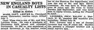 Notice from Boston Herald, Boston MA, 17 Aug 1918, page 3 that Private Ralph J. Loveren had been killed.