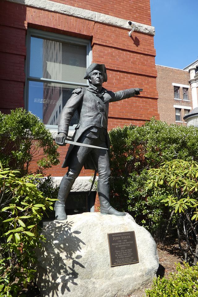 John Stark statue with plaque (to follow) that stands outside the City Hall Annex building on Market Street in Manchester NH. Photograph taken by Heather Wilkinson Rojo and used here with her permission.