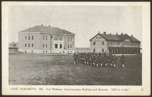 Postcard of Fort Williams, Cape Elizabeth, ME showing troops in formation outside of the administration building and barracks.