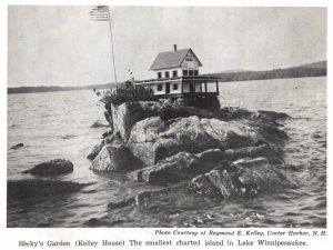 The photograph most frequently published of Becky’s Garden was one reportedly taken by Raymond E. Kelley of Center Harbor, NH in the 1940s or later (which I suspect would be around the same time that the dollhouse placing tradition first began). Several versions of this particular photo has been published many times in newspapers and on the Lake Winnipesaukee Museum web site. I have used a copy provided by Richard Marsh on his web site of New Hampshire photographs. The book “The Boats and Ports of Lake Winnipesaukee,” by Bruce D. Heald published in 2012 shows this same photograph stating, “The house was built by Lewis P. Kelly of Centre Harbor specifically for this island.” That Lewis aka Louis P. Kelley happened to be the photographer’s father. Louis Kelley was born May 1874 in Moultonborough NH and died 12 August 1950 aged 75 in Laconia NH. The Kelley family hailed back several more generations as residents of Moultonborough, Center Harbor, and Meredith, New Hampshire. Unfortunately no Rebeccas or Beckys appear in their immediate family line. The book author, Bruce Day Heald, knew his local history and so probably got his story right. He worked as the chief purser for over 50 years on the M/S Mount Washington Cruise Ship and was the author of over 40 books about history and heritage of the New Hampshire Lakes Region (he died in 2015).