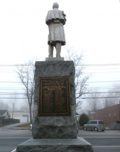 After the Armistice of 1918, a list was compiled and a bronze tablet bearing the names of Charlestown citizens who had served in World War I was added to the west face (rear) in 1929.  The monument reads as follows, with an asterisk (star) denoting the soldier who did not return home.  [Editor’s note, the comments in parentheses in the following list do not exist on the original monument, as they are notes I have added to show their service regiments.  The names in brackets are those who claimed Charlestown NH as their home but they are not listed on the Charlestown NH plaque].