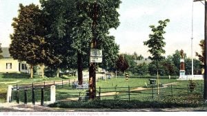 Edgerly Park, Farmington NH from old postcard of J.W. Brown. The land was donated to the town by James B. Edgerly in 1889 with the condition that a veterans monument would be placed here. Memorial Day events have been held here for over 100 years.