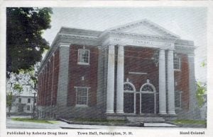 Farmington Town Hall. The WWI honor roll monument sits in front of this building. Old postcard property of J.W. Brown