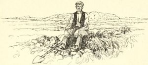Sketch of an Irish man, from “Irish ways,” by Jane Barlow; George Allen & Sons, (1909) from the University of California Libraries; on the Internet Archive.