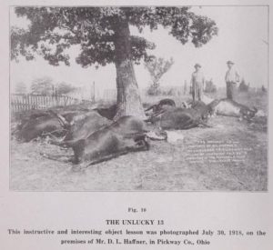 Photograph of 13 unlucky cows killed by a lightning strike. From book: Lightning, and petroleum storage tanks, etc. by West Dodd; 1920. Internet Archive.