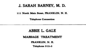 Advertisement in the 1907 NH Woman Suffrage Association Report by Dr. Barney, and her companion, Abbie L. Gale.