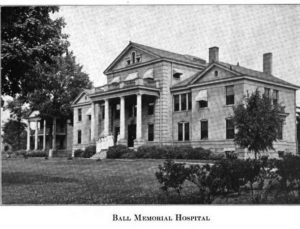 Photograph of Ball Memorial Hospital in Piqua Ohio. The $20,000 to build this hospital were provided by Julia B. (Ball) Thayer in honor of her brother Delos Ball. Julia Thayer died before the building was completed. From book, The First Century of Piqua, Ohio,” 1916, p 184