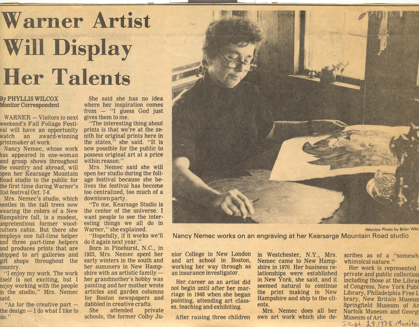 Locally she was an active member of the League of New Hampshire Craftsmen, and the New Hampshire Art Association. She was also active in community work in Warner NH. The League of New Hampshire Craftsmen honored her work and her teaching in an exhibit, “The Mentor Collection,” in 2000. On 29 September 1978 the Concord Monitor presented a feature article about Nancy Nemec.