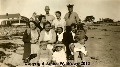 Group shot of summer servants of Mr. & Mrs. Aretas B. Carpenter, taken at Straw Point, Rye NH. Nellie Ryan on left, 2nd row from top.