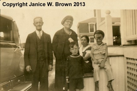 “Taken on back stairs of A.B. Carpenter Summer Home, Straws Point, Rye, N.H. From left to right, Charles A. Manning, chauffeur; Addie (Ryan) Manning his wife, Nellie Ryan, cook and sister to Addie sitting on stairs. The two young children are Maurice Cronin and Robert J. Manning, grandchild and son of Charles and Addie.
