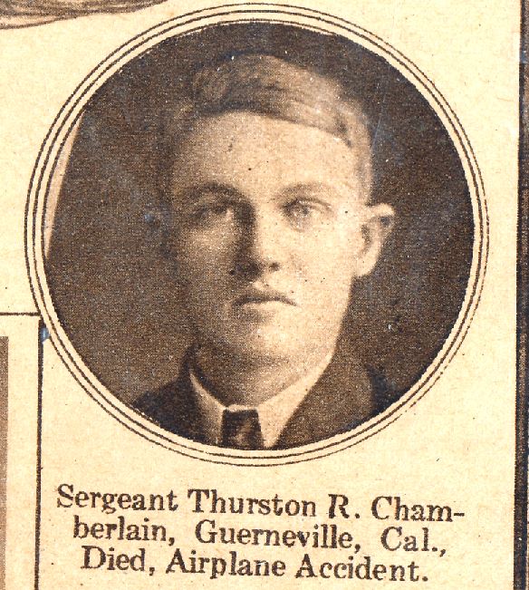 The local newspaper reported that Thurston had attended San Rafael High School and had been a resident of Novato, Marin Co., California for many years. He enlisted from Woodland, California in the aviator corps [another newspaper says signal corps] in 1917.  In addition to his parents, he had a sister at the time of his death, Mrs. Alger Scott of Novato, California, along with a brother and sister living at Woodland, California.  He was 25 years old at the time of his death.