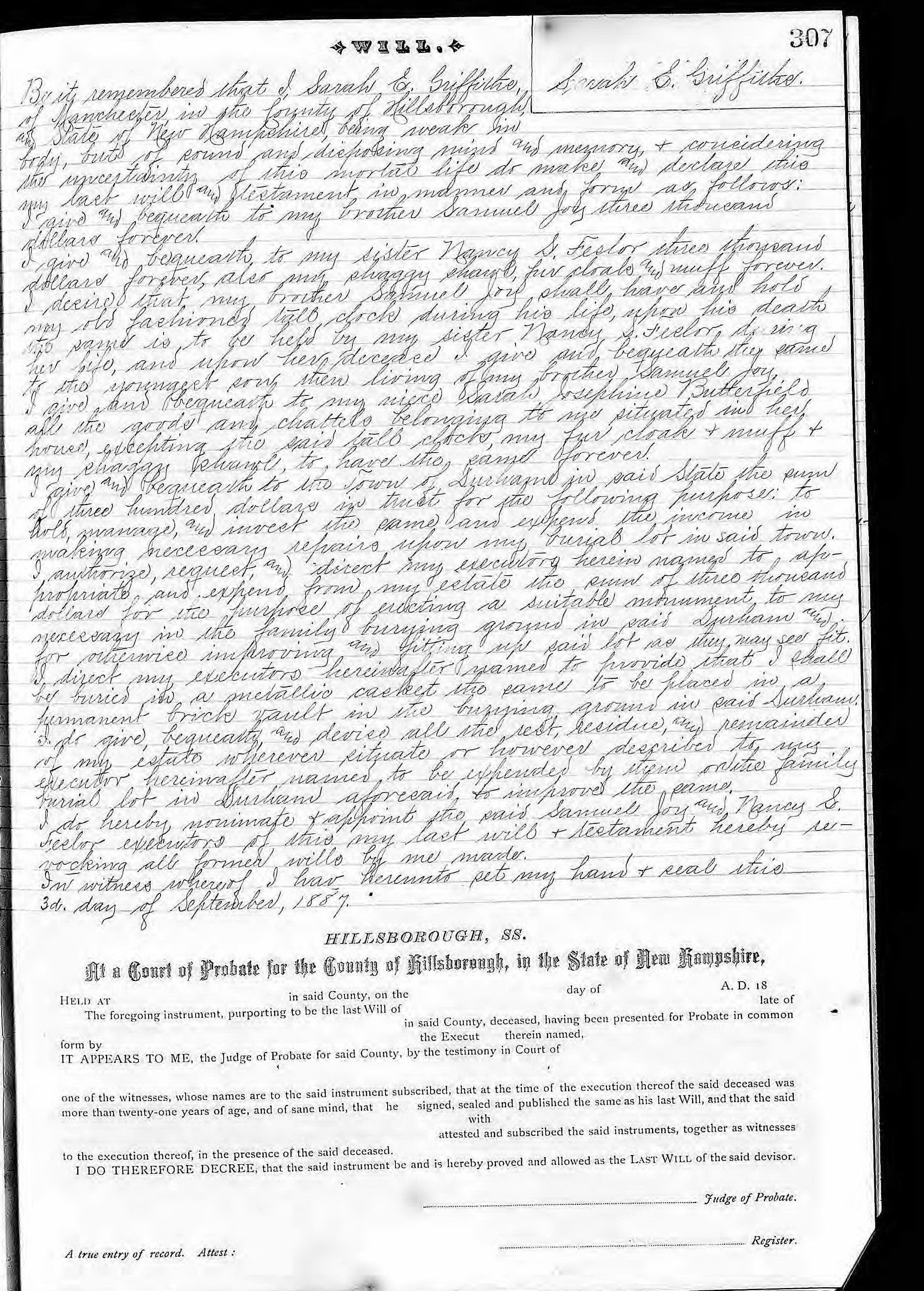 The story begins with the marriage of Sarah E. Joy to David F. Griffiths on Feb. 11, 1846. Descended from Samuel Joy who was born at Salisbury, Mass. in 1706 and was drowned in the Exeter river in 1752, Sarah was the daughter of Ebenezer Joy. She had several brothers and sisters, among them Nancy S. and Samuel, who were later named as the administrators of her will. She was also a cousin of James F. Joy who nominated James G. Blaine for the presidency at the Chicago convention of 1880 when Blaine and Grant were deadlocked for seven days and James A. Garfield was finally nominated as a compromise candidate and subsequently elected.