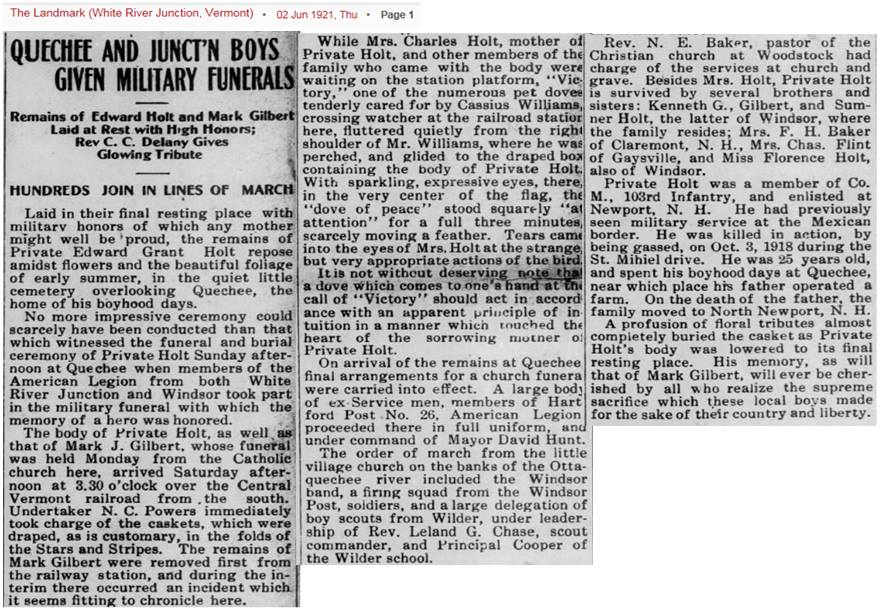 Edward Grant Holt | Corporal | Died of Wounds (gassed) 3 October 1918, France |Co. M 103rd Infantry | Citation for Bravery | Quechee Cemetery (Riverside), Quechee VT | [5]