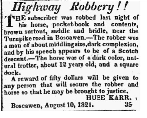 Advertisement by Huse Karr of a robbery in 1821.