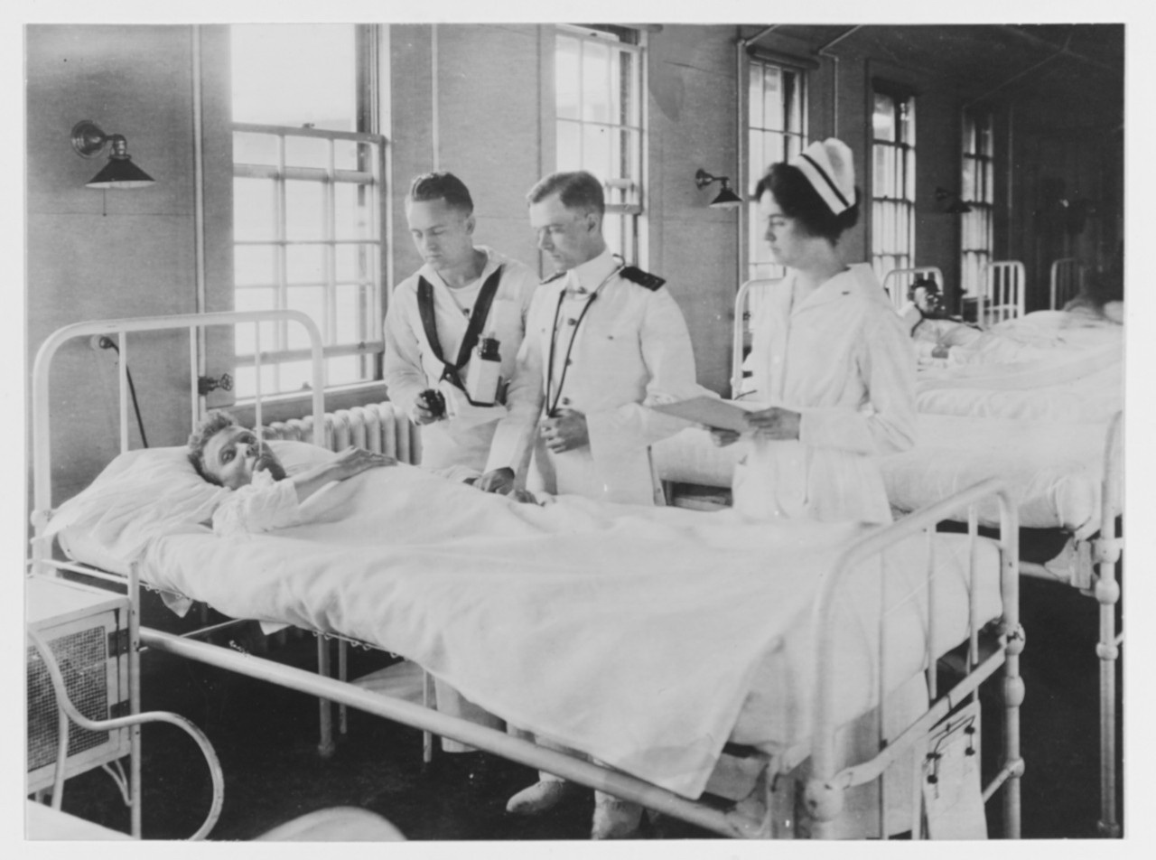 U.S. Naval Hospital, Chelsea MA. Surgeon, nurse and corpsman examine a patient in Ward 6, Group 1, 2 June 1919. U.S. Navy History and Heritage Command Photograph.